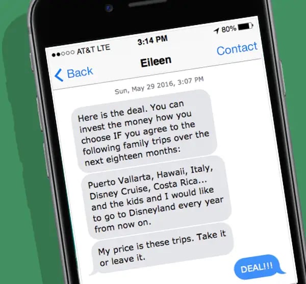 Eileen had been rightfully resistant to the idea. Eventually, though, she agreed to a deal: I could make the transfer, but I had to promise my children that I’d take them on a number of expensive trips.