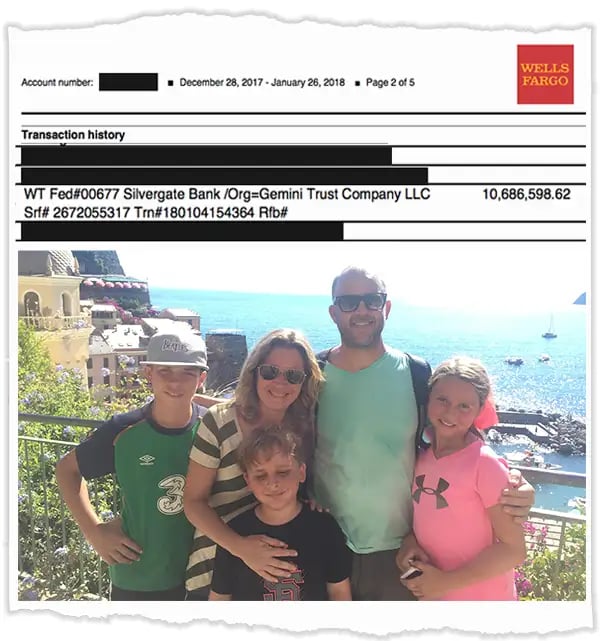 Top: Dan’s bank statement from December 2017 to January 2018, showing a Gemini transfer of $10.7m; Bottom: The family in Italy — one of the agreed-upon destinations (Courtesy of Dan Conway)