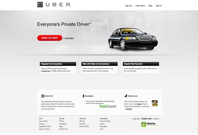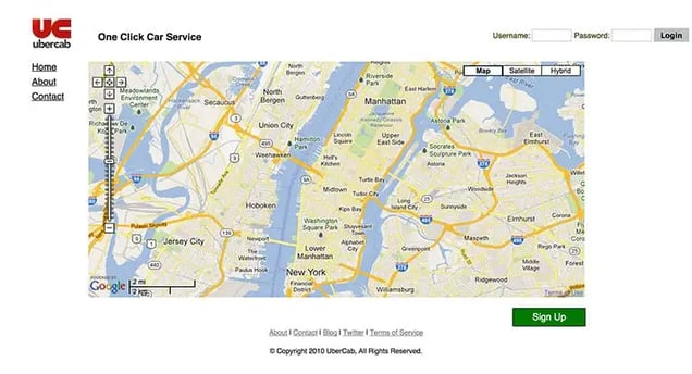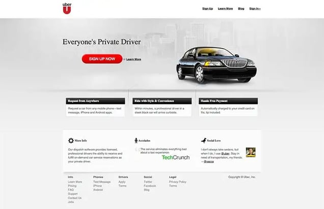 Garrett Camp and Travis Kalanick created Uber to feel like VIPs when going to clubs. Their first website was only used by friends. Its design was bare, four links and a bright red “UC” for the logo.