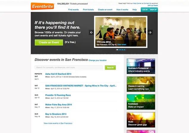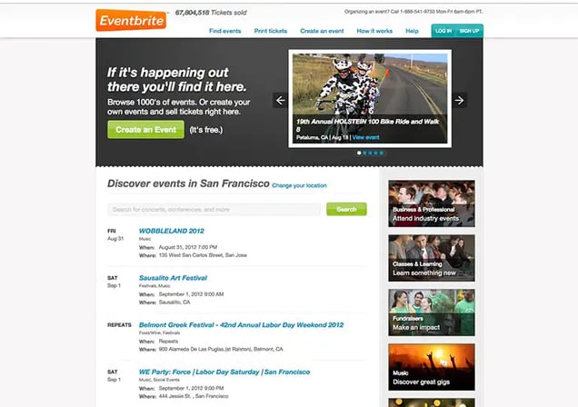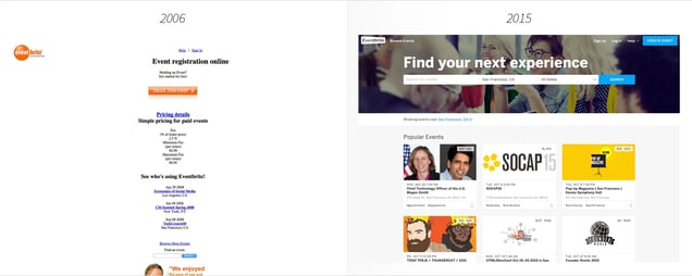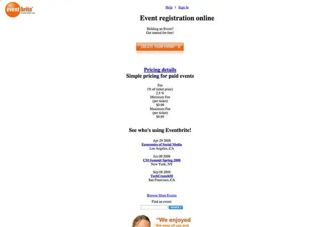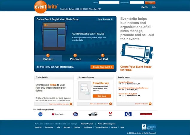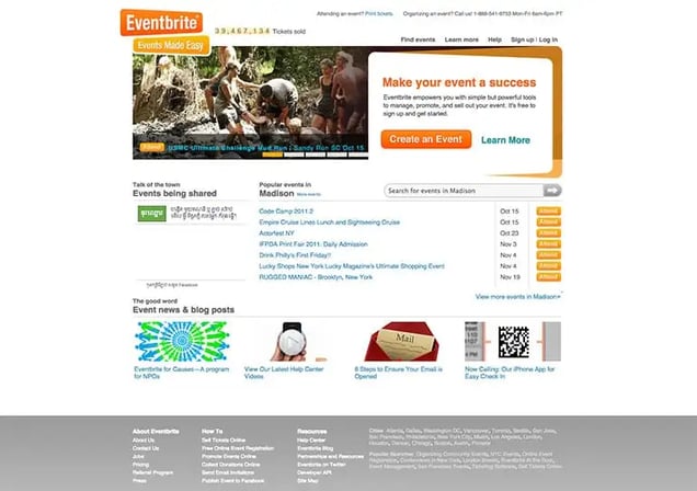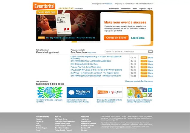 Eventbrite wins the award for most improved website. Since it’s founding in 2006, they’ve done a marvelous job in transitioning from a very simple Geocities style website to a sleek web 2.0 property.