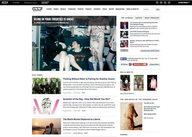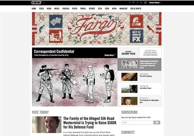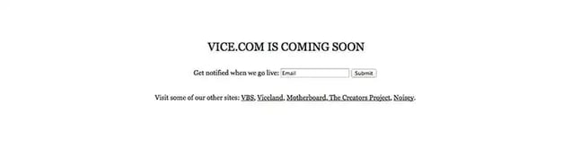 What I love about Vice’s evolution is their “Coming soon” page in 2011. It’s a no frills white landing page with a simple email box.