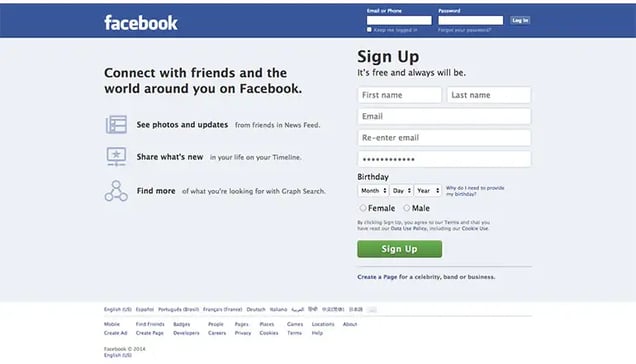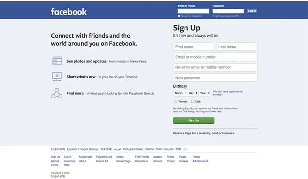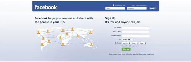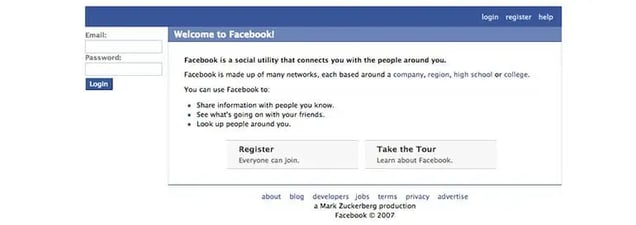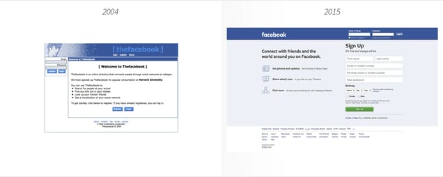In September of 2005, at Sean Parker’s suggestion, the name changed to Facebook.com. They paid $200,000 for the domain name.Like Craigslist, Facebook’s homepage has stayed relatively unchanged over the last decade.