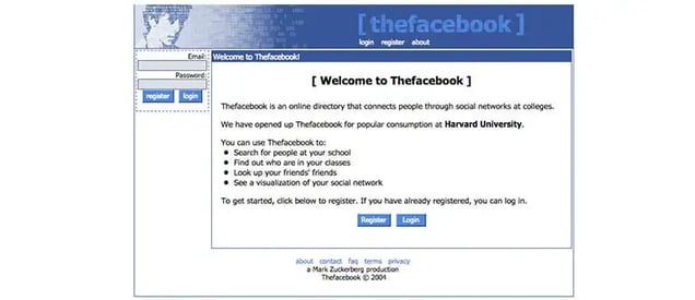 The bottom of the 2004 homepage has a line that says, “A Mark Zuckerberg Production.”