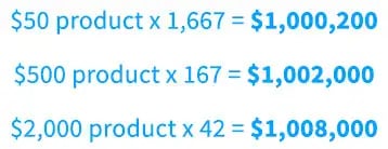 - Isn’t it surprising how you need sell 40x more of the $50 product each month to equal the $2,000 product? (Of course, it’s much harder to sell a $2,000 product than a $50 product.)
