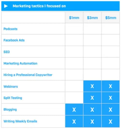 This chart should surprise you — not because of the things we did, but because of the things we chose not to do. If you listen to the advice of internet pundits, they’ll tell you how you “need to” use podcasts, SEO, SEM, marketing automation, email marketing, webinars, and on and on. Ignore them. The worst thing in the world is to be mediocre at 15 different platforms.