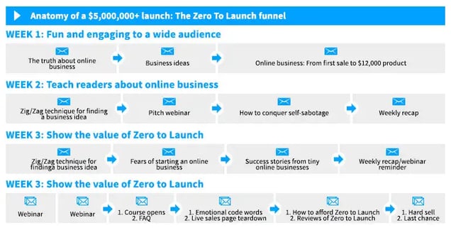 This is the sales funnel for the product, consisting of emails, blog posts, and webinars. Certain marketing elements are obvious, but others are not.