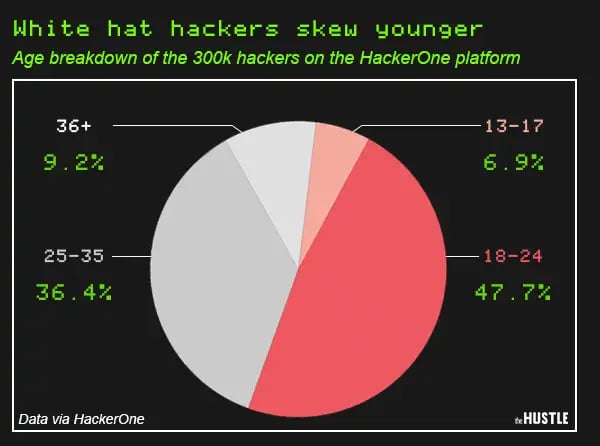 The age breakdown of the 300k hackers on the HackerOne platform (data via HackerOne; visual by The Hustle)