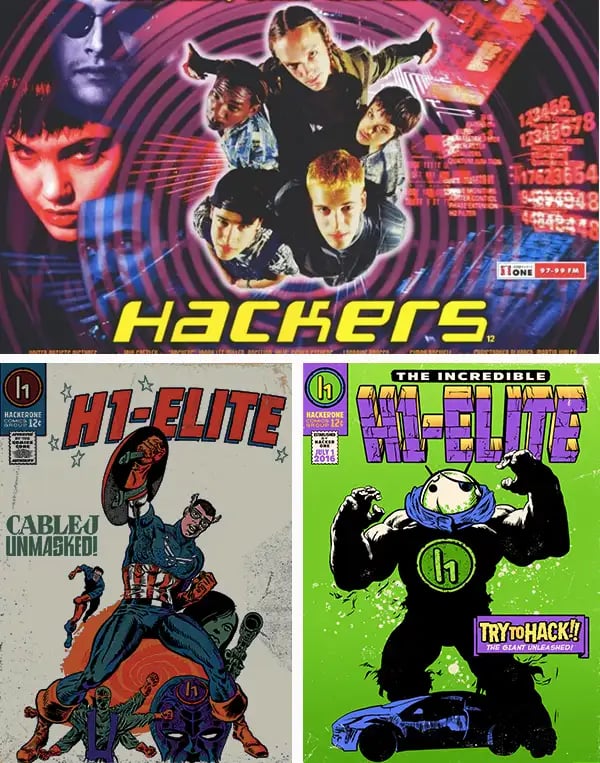 Top: A poster for the 1995 film Hackers (via Movie Poster Shop); Bottom: Jack Cable and Santiago Lopez depicted as comic book superheroes by HackerOne (via HackerOne)