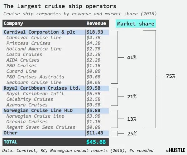 The global market comprises dozens of cruise lines and more than 250 ships. But 3 players — Carnival Corporation & PLC, Royal Caribbean Cruises LTD, and Norweigan Cruise Line HLD — control roughly 75% of the market.