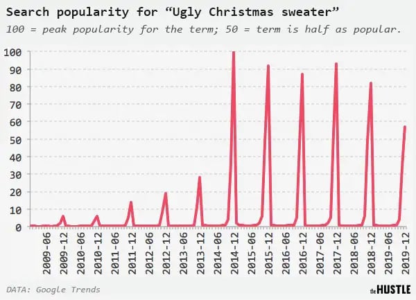Search data for “Ugly Christmas sweater” over time (Google Trends / The Hustle)